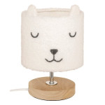Lampa uwodzi drewnianą podstawą i lnianym abażurem w kształcie głowy misia. Idealna do dekoracji stolika nocnego, lampa ta może być również umieszczona na komodzie lub komodzie.